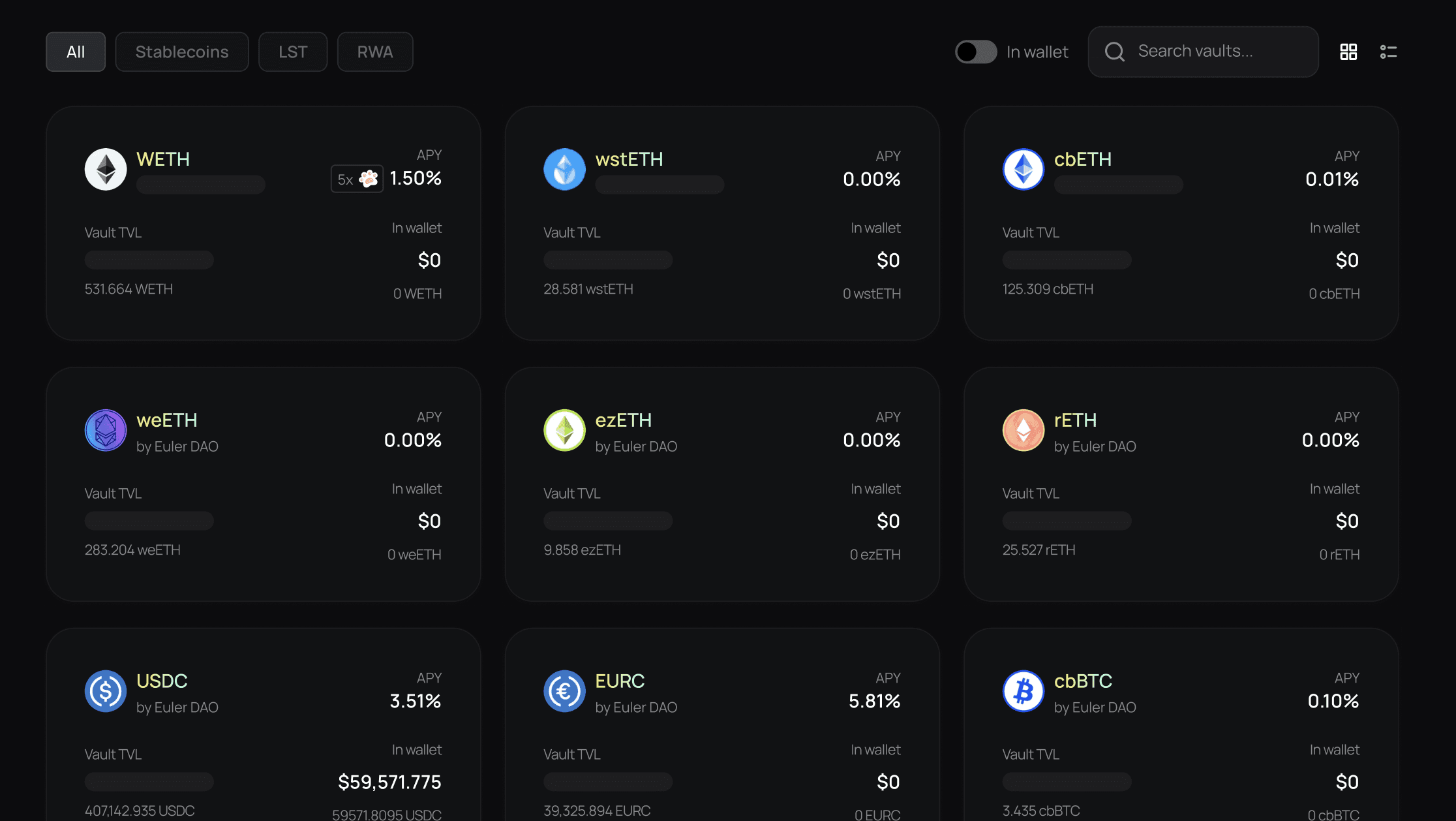 Supply assets to lending markets and automated vaults to earn interest and passive income across major tokens , stablecoins, and long-tail assets.